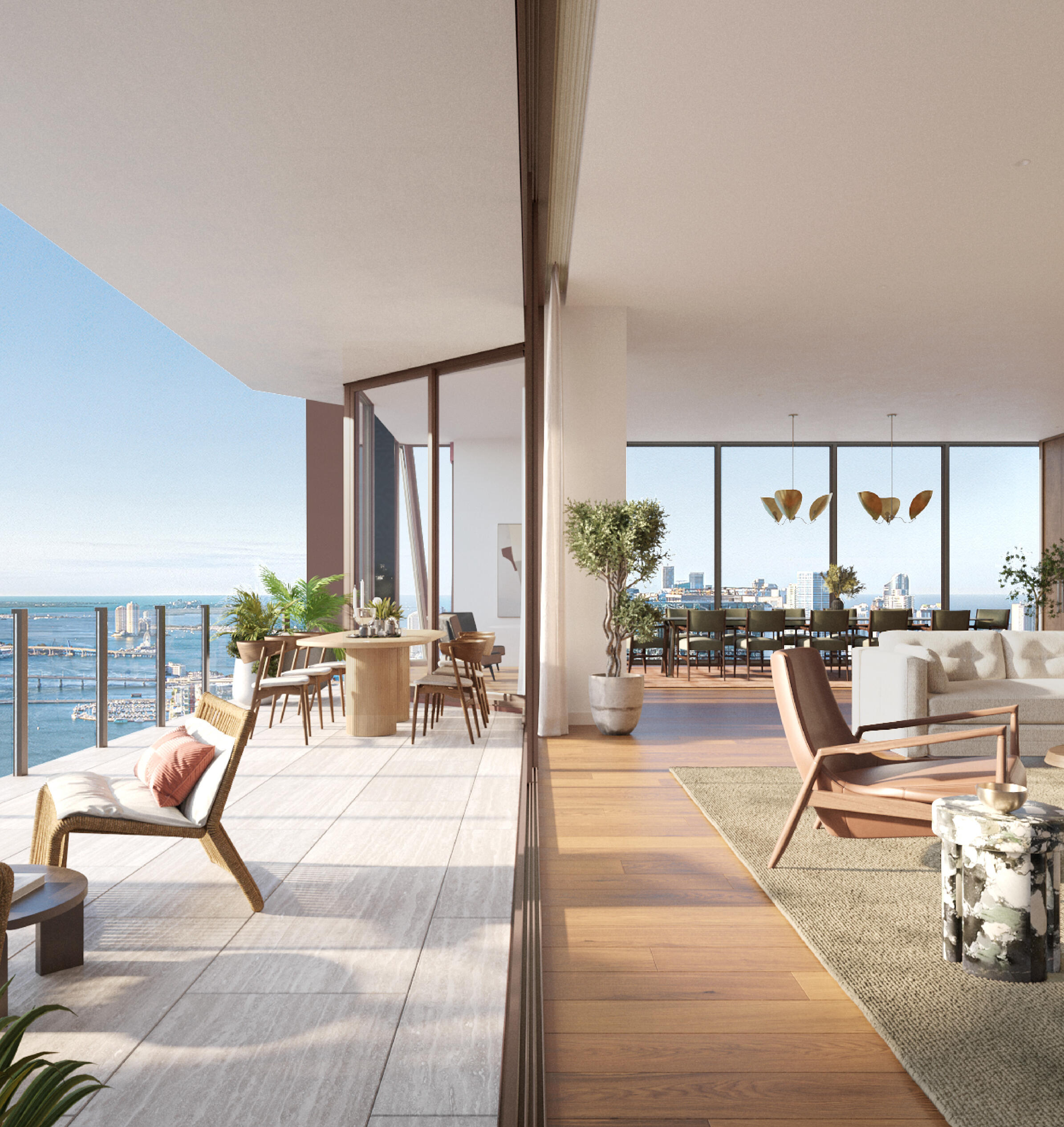 - Sweeping, panoramic views of Biscayne Bay and the Atlantic Ocean- Entry foyers open to expansive floor plans featuring 10-to-11-foot ceiling heights- Floor-to-ceiling energy windows throughout provide unobstructed views- Spacious sunrise and sunset terraces across every residence- Choice of wood or porcelain flooring complemented by custom millwork for doors, cabinets, and trim
